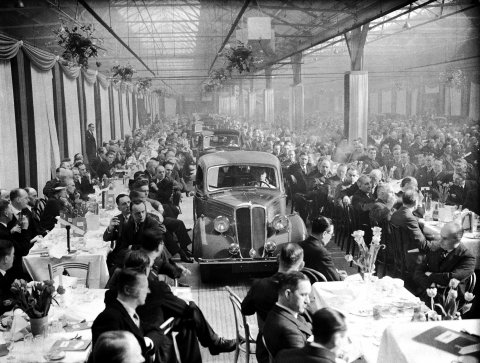 Cars parading past diners at the Standard Motor Company's