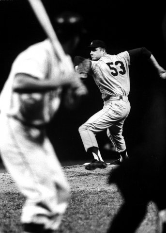 Don Drysdale unloads on this batter with a high inside brushback pitch -