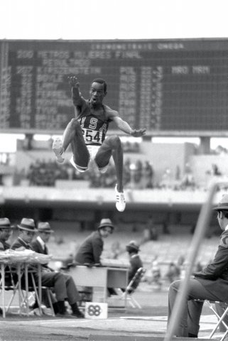 USA's Bob Beamon breaks the world record in the long jump by nearly two feet during the 1968 Mexico City Olympic Games
