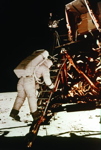Neil Armstrong realized that they were heading into a field of boulders on the northeast shoulder of a crater the size of a football field. Drama was the last thing that anyone had wanted. A warning light was telling him he had less than 60 seconds of fuel left, but they were close now and it was just a matter of easing themselves down. Forty seconds had passed since the sixty-second warning, and Armstrong stated “The Eagle Has Landed.” For the astronauts, the landing had been the big moment of the mission. But, for the waiting world, the big moment was still to come… the first footstep. Armstrong stood on the pad for a moment or two, testing the soil with the tip of his boot before he proclaimed, “That’s one small step for a man, one giant leap for mankind.”