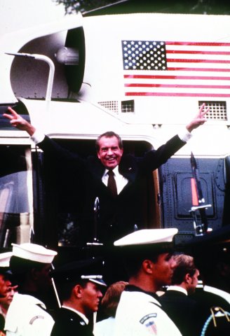 On August 9, 1974, President Richard Nixon of the United States prepares to board the Presidential helicopter to leave the White House for the last time after delivering his resignation speech following the Watergate scandal.