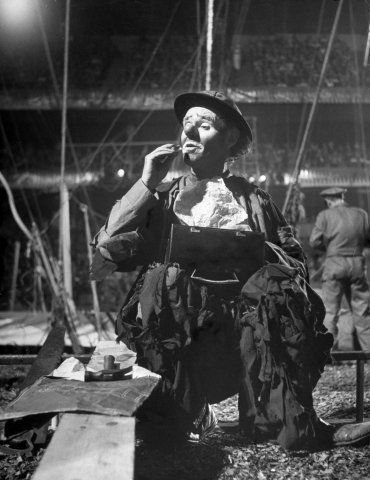 Emmett Kelly Sr. first circus job was with Howe’s Great London Circus with Emmett performing an aerialist act and doubling as a white faced clown. He married Eva Moore, another circus trapeze artist, and they performed together as the “Aerial Kellys” with Emmett still performing occasionally as a white faced clown until 1923. The next year, Eva became pregnant and Emmett tried to increase his salary by developing a new clown character for the show based on his sketches of Weary Willy. His boss of the circus thought that the tramp clown wasn’t appropriate for the circus. Weary Willy was, in his opinion, too scruffy and dirty-looking. Later, in 1933, during the Great Depression, the appearance of tramps and hobos became more acceptable to American audiences, and Emmett introduced his Weary Willy character full-time.