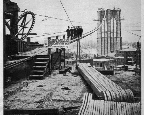 In 1855, John Roebling, the owner of a wire-rope company and a famous bridge designer proposed a suspension bridge over the East River after becoming impatient with the Atlantic Avenue-Fulton Street Ferry. Roebling worked out every detail of