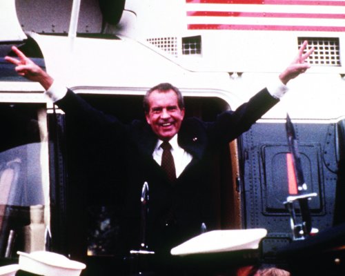 On August 9, 1974, President Richard Nixon of the United States prepares to board the Presidential helicopter to leave the White House for the last time after delivering his resignation speech following the Watergate scandal.